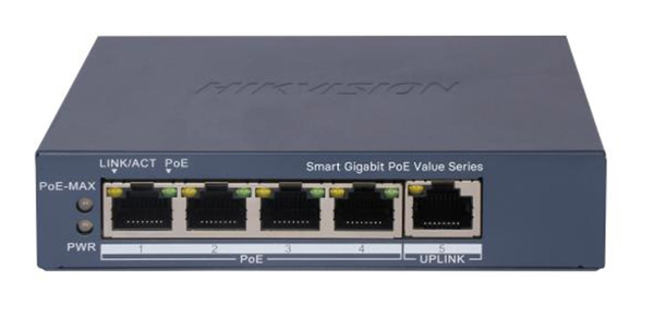 – 4 cổng PoE RJ45 Gigabit, 1 cổng RJ45 Gigabit