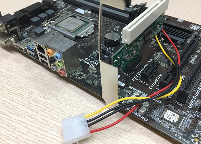 Cáp nguồn qua khe cắm SATA power, cắm cạnh (không vướng vào card pci).