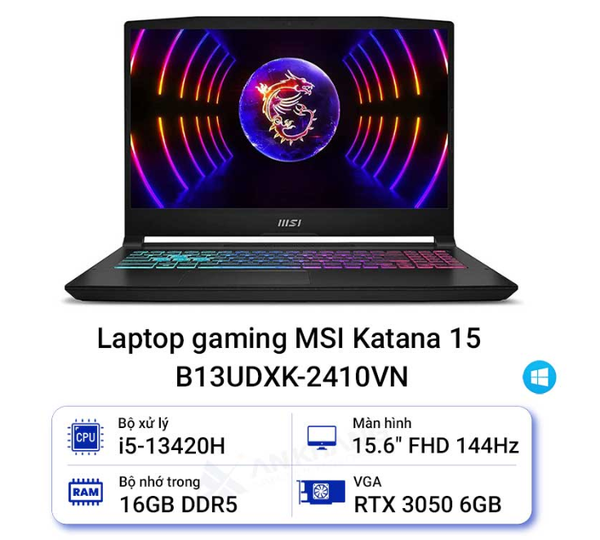 Laptop MSI Katana 15 B13UDXK-2410VN (i5-13420H | 16GB | 512GB | 3050 6GB | 15.6 inch FHD IPS 144Hz | Win 11 | Đen) Giá đã được giảm theo CT đổi điểm HSSV và GV