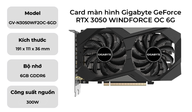 VGA GIGABYTE GeForce RTX 3050 WINDFORCE OC 6G (GV-N3050WF2OC-6GD) (4 cổng xuất hình 2xHDMI + 2xDP)